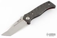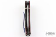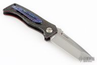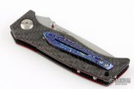 This Mini-Adamas by Shane Sibert features a hand rub satin finished blade with notched thumbrest and dual thumbstuds, has fullers. The handle has carbon fiber scales with red liners, black titanium liners, tip up mokuti clip. Nice detent, lockup and blade seating. Comes with nylon zippered case. From the 2021 USN Gathering.