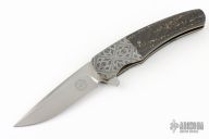 Gold snakeskin FatCarbon handle scales meet seamlessly to mosaic damascus bolsters hand forged by Prinsloo. The influence of Salem Straub, is clearly visible in the highly detailed damascus bolsters. The 3D machined, anodized titanium pocket clip is mounted for tip-up, right side carry.