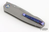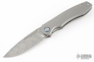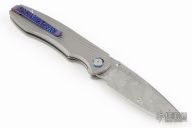 This knife features a Damasteel drop point blade with dual fullers and a notched thumbrest/flipper tab.  The handle features milled titanium frame.  Titamacus pivot collars and a matching tip-up pocket clip.  Includes the original box and papers.  Excellent Condition.