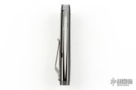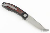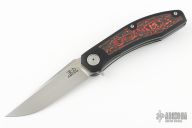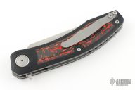 Black G-10 handle scales feature Mars Valley FatCarbon inlays on both sides. Bead blasted Gr6 titanium liners keep this full sized knife light yet strong. The backspacer is black G10. Raised, polished collars surround the pivot. The handle is completed with a bead blasted titanium pocket clip mounted for right-side, tip-up carry.