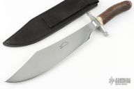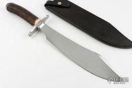 This Bowie by Boyd & Fireman features a high satin finished blade with flared ricasso, .145" blade stock and 2.412" blade depth, hidden tang construction. The handle has steel guard and butt with a stag grip. Comes with a black leather sheath and a zippered case. Has some oxidation on the butt, and a few light scratches, otherwise excellent condition.
