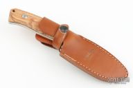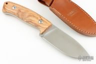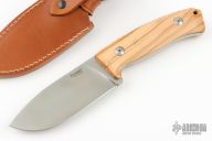 This M3 Hunter by LionSteel features a full flat ground satin finished drop point blade with notched thumb rest. 0.199" blade stock and 1.583" blade depth. The handle is comprised of 3D milled Olivewood scales over full tang construction. Lanyard hole in pommel. Includes leather sheath with belt loop and original box. Excellent condition. Blade Steel: Niolox