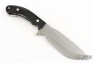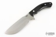 This JBA LT by Bark River Knives features a drop point satin finished blade with notched thumbrest, .186" blade stock and 1.866" blade depth, full tang construction. The handle has black canvas micarta scales with aluminum pins and lanyard tube. Excellent condition. Comes with original box and brown leather sheath.