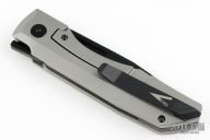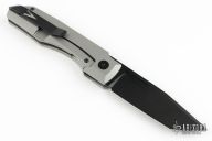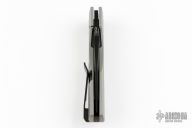 This Impulse by Vero Engineering features a black washed blade with notched thumbrest and flipper. The handle has a tumbled titanium frame with black titanium hardware, tip up clip with hidden screws and backspacer. Nice detent, lockup and blade seating. Comes with a zippered case and COA. Excellent condition.