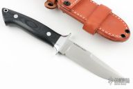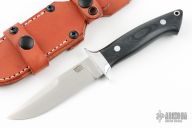 This Chute Knife from Bark River Knives features a clip point satin finish blade with false top edge, marked "First Production Run" on the "B" side, .160" blade stock and .962" blade depth, mortise/hidden tang construction. The handle has a stainless steel guard with a black canvas micarta grip. Lanyard hole and lanyard in pommel. Includes original box and leather sheath. Excellent condition.