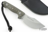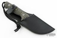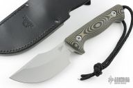 This Pathfinder Heavy Duty Skinner by Treeman Knives has an upswept blade with a false top edge. The blade is 57/58 Rc and vacuum heat treated in a state of the art furnace. It will out cut and hold an edge as good as or better than any knife made. The blade thickness is .251" thick and 1.770" deep. The handles are black/green G-10. Comes with a black leather sheath with belt loop and original box. Excellent condition.