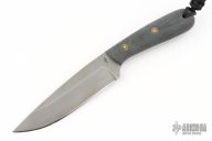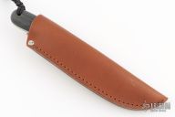 This knife by Battle Horse Knives features a satin finished drop point blade with notched thumbrest, .188" blade stock and 1.405" blade depth, full tang construction. The handle has black canvas micarta scales. Comes with a brown leather sheath with leather belt loop. Comes with original box and COA dated 8/26/21. Excellent condition.
