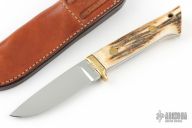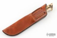 This Big 7 by Jimmy Lile (no dot) features a satin finished blade with .181" blade thickness and 1.026" blade depth, full tapered tang construction. The handle has a brass guard and pins, stag scales and red liners. Includes a Jimmy Lile brown leather sheath. Excellent condition.