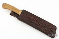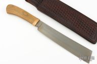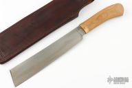 This Chopper from Master Bladesmith John Fitch features a hand rub satin finished blade with .269" blade stock and 1.863" blade depth, hidden tang construction. The handle has a brass guard with lignum vitae grip. Comes with a hand tooled brown leather sheath by Rowe's Leather. Comes with a zippered case. Has some oxidation and patina on the blade, otherwise good condition.