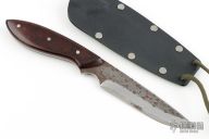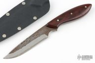 This neck knife by Master Smith Murray Carter features a satin finished San Mai blade with hammermarked flats, .099" blade thickness and .952" blade depth, full tapered tang construction. The handle has rosewood scales with nickel silver and mosaic pins. Comes with kydex neck sheath. Has scratches and oxidation spots on the edge, otherwise good user condition.
