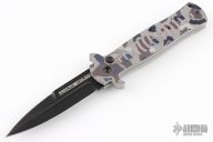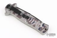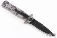 This collaboration between Darrel Ralph and Ryan Wilson of Wilson Tactical is the Stiletto Auto with a desert camo aluminum handle. Black coated blade with blood groove in the center and a ground but not sharpened top edge. Smooth firing auto with a strong lock up. Excellent condition. Comes with original box and papers.