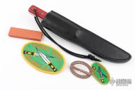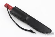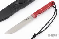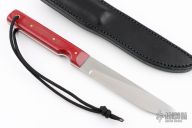 This Model 10 Salt Fisherman and Household Utility features a satin finished blade with notched thumbrest, .134" blade stock and .872" blade depth. The handle has red linen micarta scales with brass pins over full tang construction. Brass lanyard tube with lanyard in pommel. Includes a black leather sheath, original paper wrapping, two Randall patches and a Randall pin. New from maker.