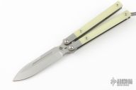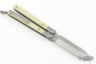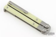 The SPD Invictus-Bali GITD is a utility style, bi-handle folding knife, featuring titanium billet handles with integrated bolsters and Hyper-Glow GID scales with 3 fullers each, a Böhler M390 blade, new, updated bearing pivot, and a titanium spring latch. Additional details include 2-tone machine satin and bead blast blade finish, jimping on the ears and back spacers, and a billet titanium pocket clip. Specifications: