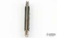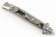 This Swivel Bolster Auto has a bayonet ground blade with false top edge. The handle is composed of a steel front and rear bolsters, brass liners all complemented by black lip pearl scales with black liners. Excellent condition.