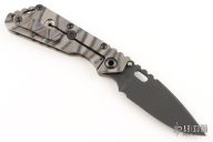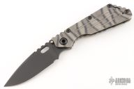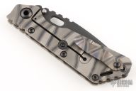 This Mick Strider Performance Series SMF framelock folder features a black oxide blade with thumbhole and notched thumbrest. The handle has a Disruptive Strider Striped titanium frame with titanium clip, tip up carry. Jimping on blade spine. Includes Hinderer "Lock Bar Stabilizer" for maximum reverse lock retention. Nice detent, lockup and blade seating. New Condition.