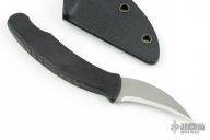 This L-via by Kopis Design features a satin finish hawkbill blade with .061" blade stock and .784" blade depth, hidden tang construction. The handle is glass filled nylon. Comes with a kydex sheath and original box. New condition.