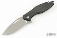 This Arius by Koenig knives features a stonewash finished blade with thumbhole and flipper. The handle has a smooth carbon fiber and bead blasted titanium frame, titanium tip up clip with hidden screws, and a titanium backspacer. Has ceramic bearings and a ceramic detent ball. Nice detent, lockup and blade seating. Comes with original box and COA dated August 16, 2021. Excellent condition.