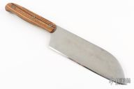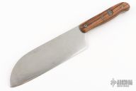 This Santoku by A.F. "Barney" Barnett features a satin finished blade with .105" blade stock and 2.030" blade depth, full tang construction. The handle has wood scales with mosaic pins, inlaid medallion with makers logo. Comes with a zippered case. Has some scratches, has been sharpened, otherwise good condition.