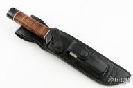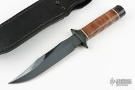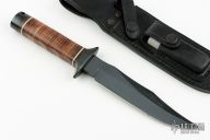 This S1 Bowie (Vietnam 5th Special Forces Group) has a black coated clip point blade with hidden tang and double guard. Blade width is just under 1/4", depth 1-1/4". Handle is contoured stacked leather with white spacers, black coated steel butt cap and lanyard hole. Comes with a black leather sheath. Very Rare. Blade is marked "SOG SPECIALTY KNIVES" on the presentation side. The non-presentation side has the Special Forces crest on the ricasso and "VIETNAM 5th Special Forces Group" on the swedge. Comes with original sheath and box. Excellent condition. SK5 Steel.