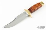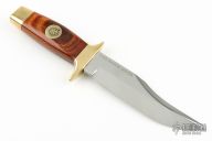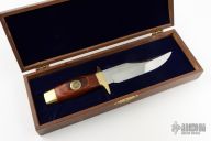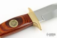This fixed blade by Smith and Wesson features a wood handle with brass guard and butt cap. Mirror polished bowie style blade with .246" blade stock and 1.360" blade depth. Has "Texas Rangers 1823-1973" stamped on blade and a "Texas Rangers Commemorative Commission" inlay on handle. Has some light scratches, otherwise excellent condition. Includes wooden display box. "TR15103" stamped on the spine of the blade.