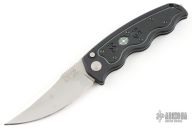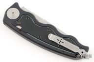 This SOG-TAC Auto has a satin finish upswept blade with notched thumb rest. Handle is black anodized aluminum with safety, lanyard hole, and stainless steel tip up clip - RH/ LH reversible. Has a couple light scratches, otherwise excellent condition.