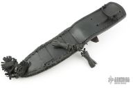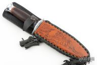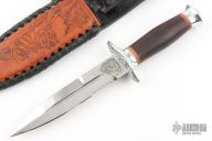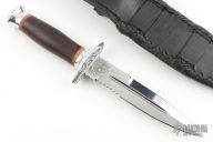This dagger (please let us know if you know who this maker is) features a mirror polished double edged blade, one partially serrated edge, fullers, engraved ricasson on each side, .193" blade stock and 1.095" blade depth, hidden tang construction. The handle has an engraved aluminum guard and butt, rosewood grip with birch bark spacers. Comes with a black/brown leather sheath with a tiger on the front. Excellent condition. Dated 2007.