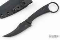 This Ring Tailed Thorn by Greg Moffatt features a black cerakoted blade with sharpened top edge and notched thumbrest, .166" blade stock and .920" blade depth, full tang construction. The handle has black g10 scales with a 1.075" ring. Comes with a kydex sheath. Has a couple light scuffs, otherwise Excellent condition.