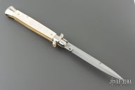 This 11" Picklock Auto by Frank Beltrame features a mirror finished bayonet ground blade with false top edge. The handle has mirror polished nickel silver bolsters, front and rear, mother of pearl scales, mirror polished brass liners and stainless steel spring. Excellent condition.