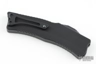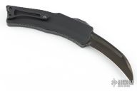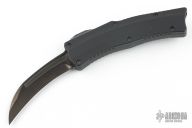 This Custom ROC by Heretic Knives features a hand ground DLC coated blade with fullers and notched thumbrest. The handle has a black aluminum chasis with atip down DLC titanium clip with ceramic ball. Fat Carbon Black Dunes inlay in the push button. Comes with original box and COA #052. Excellent Codnition.