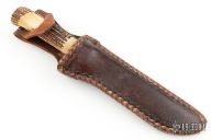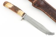 This Morseth Brusletto Geilo Stag Hunter has a satin finished laminated steel clip point blade with .137" blade stock and 1.047" blade depth, hidden tang construction. The handle has a nickel silver guard, stag grip and black, nickel silver and red spacers. Comes with a brown leather sheath with belt loop. Has some scratches, has been used and sharpened, otherwise good user condition.