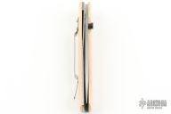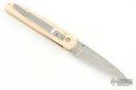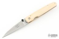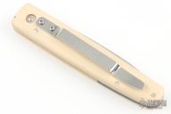 This linerlock by Junglee features a satin finished blade with a single thumbstud. The handle has ivory paper micarta scales, stainless steel liner, tip down stainless steel clip. Nice detent and lockup. Excellent condition.