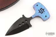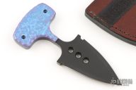 This Push Dagger by Mike Snody features a black chisel gound double edged blade with .232" blade stock and 1.477" blade depth,. full tang construction with textured and anodized titanium scales. Comes with a brown leather sheath. Excellent condition.