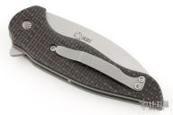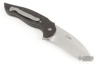 This Groundfighter by Greg Lightfoot features a satin finished recurve drop point blade with asymetrical swedge and flipper. The handle has carbon fiber scales, bead blasted titanium liners and titanium barrel spacers, stainless steel tip up clip. Includes IKBS (Ikoma-Korth Bearing System) for smooth and fast opening that requires no wrist action. Nice lockup, detent, and blade seating. Excellent condition. Comes with a zippered case.