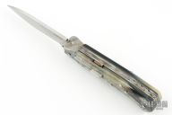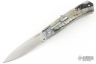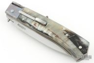 This Picklock Auto by Antonio Contini features a satin finished blade. The handle has anodized titanium bolsters and liners with buffalo horn scales. This one has a rolling safety on the spine. Nice action and lockup. Comes with original box and COA. Excellent condition.