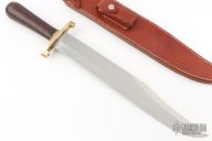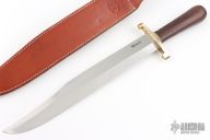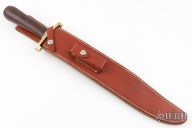 The 13" Randall Thorp Bowie by Randall Made Knives has a 13" carbon steel blade with sharpened top edge, .238" blade stock and 1.688" blade depth, hidden tang construction. The handle has a brass lugged guard, brass scalloped collar and coolie butt cap, and a rosewood grip. Comes with a brown leather sheath and a zippered case. Comes with Randall paperwork. Excellent condition.