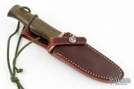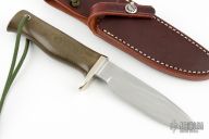 The Model 28 by Randall Made Knives is an excellent skinning and outdoors knife. Has a satin finished drop point blade with false top edge and notched thumbrest, stainless steel blade, .161" blade stock and 1.084" blade depth, full tang construction. The handle has a brass guard, green linen micarta handle and a lanyard hole at the butt. Comes with brown leather sheath and original paper wrapping. New condition.