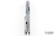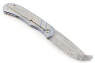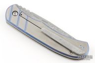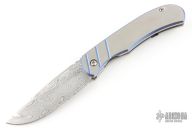 This Hornet from Clyde Challenor features a Damascus blade with notched thumbrest and front flipper. The handle has a two-tone anodized titanium frame with a Damascus tip up clip. Has a ceramic detent ball, and caged bearings. Has some scratches, otherwise good condition.