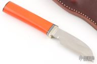 The Cattleman by Randall Made Knives features a satin finished sheepsfoot blade with notched thumbrest, .173" blade stock and .981" blade depth, hidden tang construction. The handle has a nickel silver reduced hilt, orange G-10 grip with black/duralumin spacers, nickel silver butt plate. Includes a brown leather sheath and a zippered case. Excellent condition.