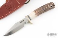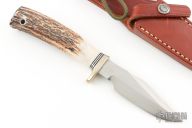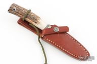 This Model 8-4 by Randall Made Knives features a satin finished blade with sharpened top edge, .163" blade thickness, 1.050" blade depth, hidden tang construction. Especially suitable for small fish and feathered game. The handle has a nickel silver guard and butt with a stag grip with black/duralumin spacers. lanyard hole. Comes with a brown leather sheath for a model 5-4 and a zippered case. Excellent condition.