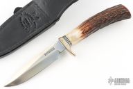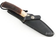 This Model 5-4 by Randall Made Knives features a clip point satin finished blade with false top edge and a notched thumbrest, .153" blade stock, .873" blade depth, hidden tang construction. The handle has a nickel silver guard and stag grip with black/duralumin spacers. Includes a black leather sheath. Excellent condition.
