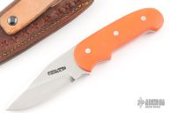 The Triathlete is a non-catalog knife by Randall Made Knives. The knife has satin finished spear point blade with notched thumbrest, .180" blade stock and 1.045" blade depth, full tang construction with custom orange G-10 scales. Comes with original black leather sheath and brown leather sheath that fits it with the scales. Excellent condition.