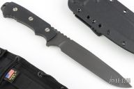 The Handle & Sheath: Machined diamond pattern knurling textured Black G-10 handle scales will help keep a solid grip in any environment. They're bolted on solid plus it has a front finger groove and guard big enough to handle a gloved hand. The tang extends out the butt end of the handle to a slightly rounded hammer surface with Hex drive lanyard hole to finish. The Fieldtac ships in a heavy duty USA Made black MOLLE compatible Nylon sheath with front pocket pouch and hard plastic insert.