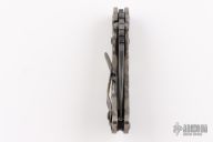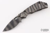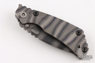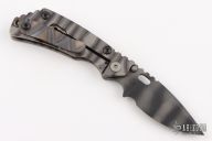 This PT by Mick Strider features a tiger striped blade with notched thumbrest and thumbhole. The handle has a Disruptive Strider Stripe finished titanium frame with matching tip up clip. New condition.