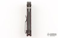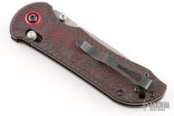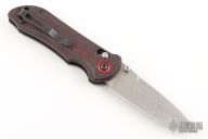 This Gold Class Stryker II from Benchmade features a drop point Odin Heim pattern Damasteel blade with swedge and dual thumbstuds. The handle is comprised of carbon fiber scales over blackened stainless steel liners and red anodized aluminum barrel spacers with matching pivot collar. Reversible tip up stainless steel pocket clip. Numbered #1356 on the blade. Includes original box and paperwork. Excellent condition.