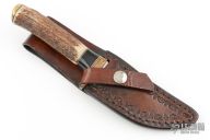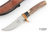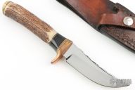This Skinner by Gil Hibben features a mirror polished blade with fileworked spine, .184" blade stock and 1.099" blade depth, hidden tang construction. The handle is comprised of a brass guard and a stag grip handle with brasspommel  and black/brass/red spacers. Includes a hand tooled brown leather sheath with belt loop. Has some patina on the brass, otherwise excellent condition.