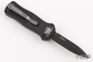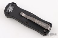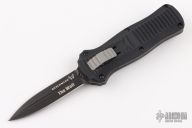 This 3350 Mini-Infidel by Benchmade features a black double edge dagger style D2 blade with fullers. The handle is comprised of a black anodized aluminum frame, ramped steel thumb slide and steel tip down clip. Has a couple light scuffs, otherwise excellent condition.