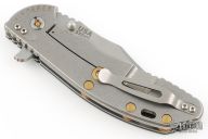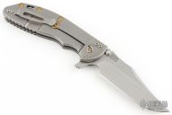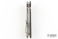 This Bowie Ground XM-24 from Hinderer Knives features a stonewash finished bowie blade with dual thumbstuds and notched thumbrest and flipper. The handle has a smooth black canvas micarta scale and stonewashed titanium frame, brass hardware, titanium filler tab and tip up clip, brass lockbar stabilizer. Has a couple light scratches, has been sharpened, excellent condition otherwise. Comes with original black G-10 scales, hardware and box.