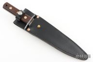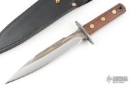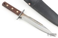 This VTF Von Tempsky Fighter by Svord features a spear point blade with nearly sharpened top edge, .233" blade stock and 1.281" blade depth, full tang construction. The handle has a steel guard and wenge wood scales. Comes with a black leather sheath and original papers. Excellent condition.