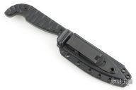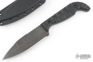 This knife features a black cerakoted blade with a notched thumbrest, .158" blade stock, 1.093" blade depth, full tang construction.  Sharpened top edge.  The handle has black G-10 scales.  Comes with a kydex sheath and a wolf patch. Excellent condition.