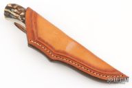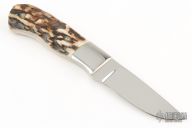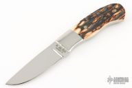 This knife by Ken McFall has a mirror polished blade with .162" bladestock, and .907" blade depth, full tapered tang construction. The handle has dovetailed stainless steel bolsters and stag scales with mosaic pins. Comes with Sonja Lee brown leather sheath. Excellent condition.